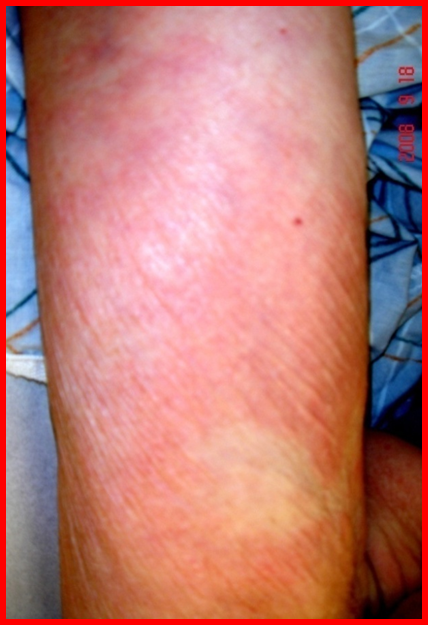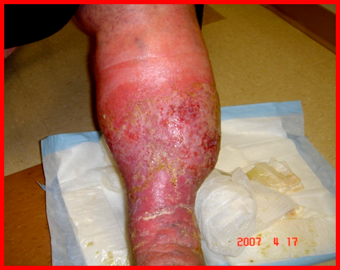 The antibacterial agent, neomycin, is a common cause of ACD. It cross reacts with paromomycin, butirosin, framycetin, tobramycin, kanamycin and gentamicin. Patients with neomycin allergy may also have concomitant sensitization to bacitracin. Medications for the treatment of leg ulcers can cause dermatitis of the legs (see figure D below). Patients with stasis dermatitis, leg ulcers, anogenital dermatitis & otitis externa are at a higher risk of developing ACD to these antibiotics.
