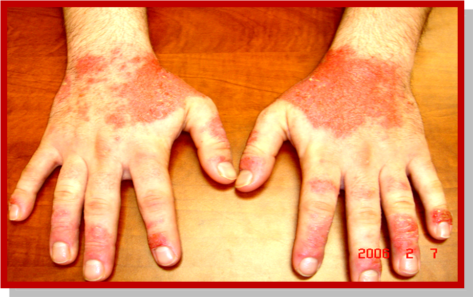 The differential diagnosis of a CD includes other inflammatory skin diseases. Atopic dermatitis (AD) usually presents at an early age and is more chronic in nature. These patients also have a personal or family history of atopy. Lesions are typically distributed on the face in infancy, on the extensors in early childhood and on the flexural areas in adolescence and adults. Patch testing (PT) should be done in patients with AD under certain circumstances: upon failure to improve with topical therapy, those with atypical distribution of dermatitis, hand eczema resistant to therapy, adult or adolescent onset AD and/or before initiating systemic immune-suppressants for the treatment of AD. Seborrheic dermatitis commonly occurs on the scalp, periauricular area, face (medial eyebrows, glabella, nasolabial folds), presternal and interscapular area. Lesions are sharply demarcated with a dull, yellowish-red appearance that may be covered with greasy-looking scales. Dyshidrotic eczema must be considered as a differential diagnosis in ACD that involves the hands. Clinical features include symmetrical, small deep-seated vesicles on the palms, soles and/or lateral aspects of the fingers. The vesicles are also intensely pruritic. Mycoses Fungoides (MF) and Cutaneous T-Cell lymphoma are also important conditions to rule out in the evaluation of an ACD. These diseases are characterized with patches that have a thin, wrinkled appearance, often with reticulated pigmentation (see figure B below). They are often present on the lower trunk and buttocks. These conditions can also present with plaques and nodules. Because of this variable presentation, a skin biopsy is required for confirmation. Pruritus varies among individuals though it is more common in the premycotic phase and may precede MF by years.