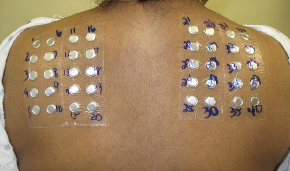 The standard and/or additional series of PT allergens are sold by companies working in close connection with the International Contact Dermatitis Research Group (ICDRG) as well as other international and national groups. A core or baseline series of PT antigens such as those used by the NACDG, the T.R.U.E. Test™ panel or the Core Allergen Series outlined by the American Contact Dermatitis Society (ACDS) may be used. However, relying on these series alone may not identify the causative allergen in all patients, leading to underdiagnoses of ACD. Therefore, the addition of supplemental PT allergens based on specific patient exposures and patient’s personal products may be needed. For an eyelid, lip and facial dermatitis, it may be necessary to include the patient’s personal products. In general, leave-on products (e.g., lipstick, rouge, moisturizer, foundation), clothing, and gloves can be tested without any modifications. Rinse-off products (e.g., shampoo, conditioners, anti-perspirants) should be diluted (10-2 or 10-3) as higher concentrations may lead to an irritant reaction. Other nonstandardized allergens, household cleansers and industrial products should be tested only by physicians with expertise on this type of testing after evaluating the MSDS information.